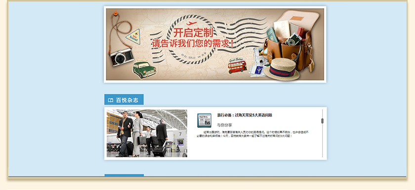 Project Description 百悦逸游于2012年初由二位资深的旅行家创办,是成都传媒集团旗下成都新闻国际旅行社有限公司的高端旅游品牌,总部位于成都高新区天府大道中段美年广场。在百悦逸游成立之前,创始团队亲自到全球三十多个国家实地考察,带着第一手的资讯和执着的信念创立了中国西部第一家真正意义上的私人定制旅行机构。百悦的旅行不是跟团挤大巴,不是十天去十个国家,更不是没完没了的... Official website address 杨浦http://www.100.travel I want to share